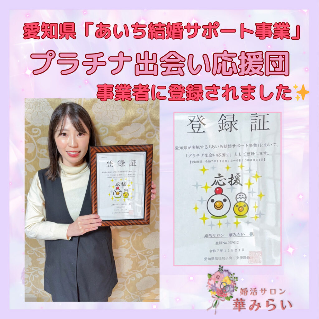 この度、婚活サロン華みらいは愛知県のあいち結婚サポート事業「プラチナ出会い応援団」に登録されることととなりました✨